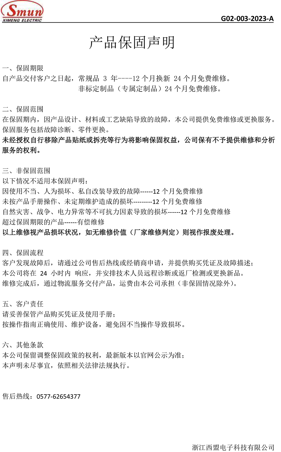 產(chǎn)品保固聲明