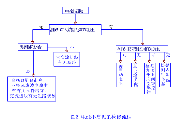 這種情況說(shuō)明電源不啟振,可按圖2所示的流程進(jìn)行檢修。