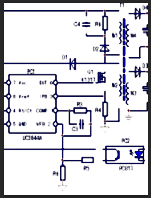 1、振蕩回路:開關變壓器的主繞組N1、Q1的漏--源極、R4為電源工作電流的通路;R1提供了啟動電流;自供電繞組N2、D1、C1形成振蕩芯片的供電電壓。這三個環節的正常運行,是電源能夠振蕩起來的先決條件。