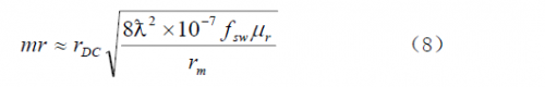 電阻損耗是變壓器或電感內部繞組的電阻產生的損耗。有兩種形式的電阻損耗:直流電阻損耗和集膚效應電阻損耗。直流電阻損耗由繞組導線的電阻與流過的電流有效值二次方的乘積所決定。集膚效應是由于在導線內強交流電磁場作用下,導線中心的電流被“推向”導線表面而使導線的電阻實際增加所致,電流在更小的截面中流動使導線的有效直徑顯得小了。式(8)給出了這兩個損耗在一個表達式中的計算式。