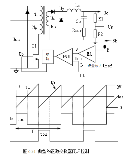6.4.1?概述圖6.31為一個(gè)典型的正激變換器閉環(huán)調(diào)度的比如。可以看出是一個(gè)負(fù)回響體系。PWM控制芯片中包含了過失擴(kuò)大器和PWM構(gòu)成電路。控制芯片也供應(yīng)許多其他的功能,但了解閉環(huán)安穩(wěn)性問題,僅需考慮過失擴(kuò)大器和PWM。關(guān)于輸出電壓Uo緩慢或直流改動(dòng),閉環(huán)當(dāng)然是安穩(wěn)的。例如輸入電網(wǎng)或負(fù)載改動(dòng)(煩擾),引起Uo的改動(dòng),經(jīng)R1和R2取樣(回響網(wǎng)絡(luò)),送到過失擴(kuò)大器EA的反相輸入端,再與加在EA同相輸入端的參閱電壓(輸入電壓)Uref比較。將引起EA的輸出直流電平Uea改動(dòng),再送入到脈沖寬度調(diào)制器PWM的輸入端A。在PWM中,直流電平Uea與輸入B端0~3V三角波Ut比較,產(chǎn)生一個(gè)矩形脈沖輸出,其寬度ton等于三角波初步時(shí)間t0到PWM輸入B三角波與直流電平相交時(shí)間t1。此脈沖寬度抉擇了芯片中輸出晶體管導(dǎo)通時(shí)間,一同也抉擇了控制晶體管Q1的導(dǎo)通時(shí)間。Udc的增加引起Uy的增加,因Uo=Uyton/T,Uo也隨之增加。Uo增加引起Us增加,并因此Uea的減少。從三角波初步到t1的ton相應(yīng)減少,Uo康復(fù)到它的初始值。當(dāng)然,反之亦然。PWM產(chǎn)生的信號(hào)可以從芯片的輸出晶體管發(fā)射極或集電極輸出,經(jīng)電流擴(kuò)大供應(yīng)Q1基極驅(qū)動(dòng)。但不管從那一點(diǎn)-發(fā)射極仍是集電極-輸出,有必要保證當(dāng)Uo增加,要引起ton減少,即負(fù)回響。應(yīng)當(dāng)注意,大多數(shù)PWM芯片的輸出晶體管導(dǎo)通時(shí)間是t0到t1。關(guān)于這樣的芯片,Us送到EA的反相輸入端,PWM信號(hào)假設(shè)驅(qū)動(dòng)功率NPN晶體管基極(N溝道MOSFET的柵極),則芯片輸出晶體管應(yīng)由發(fā)射極輸出。但是,在某些PWM芯片(TL494)中,它們的導(dǎo)通時(shí)間是三角波Ut與直流電平(Uea)相交時(shí)間到三角波中止時(shí)間t2。關(guān)于這樣的芯片,假如驅(qū)動(dòng)NPN晶體管,輸出晶體管導(dǎo)通(假如從芯片的輸出晶體管發(fā)射極輸出),這樣會(huì)隨晶體管導(dǎo)通時(shí)間添加,使得Uo添加,這是正回響,而不是負(fù)回響。因此,TL494一類芯片,Us送到EA的同相輸入端,Uo添加使得導(dǎo)通時(shí)間減少,就可以選用芯片的輸出晶體管的發(fā)射極驅(qū)動(dòng)。?圖6.31電路是負(fù)回響且低頻安穩(wěn)。但在環(huán)路內(nèi),存在低電平噪音電壓和含有豐厚接連頻譜的瞬態(tài)電壓。這些分量通過輸出Lo,Co濾波器、過失擴(kuò)大器和Uea到Uy的PWM調(diào)節(jié)器引起增益改動(dòng)和相移。在諧波分量中的一個(gè)分量,增益和相移或許導(dǎo)致正回響,而不再是負(fù)回響,在6.2.7節(jié)咱們已談?wù)撨^閉環(huán)振蕩的機(jī)理。以下就開關(guān)開關(guān)電源作加體剖析。?6.4.2?環(huán)路增益?仍是來研討圖6.31正激變換器。假定回響環(huán)在B點(diǎn)-連接到過失擴(kuò)大器的反相輸入端斷開成開環(huán)。任何一次諧波分量的噪聲從B通過EA擴(kuò)大到Uea,由Uea傳遞到電壓Uy的平均值,和從Uy的平均值通過Lo,Co回來到Bb(正好是先前環(huán)路斷開點(diǎn))都有增益變化和相移。這便是6.2.7談?wù)摰沫h(huán)路增益信號(hào)通路。?假如假定某個(gè)頻率f1的信號(hào)在B注入到環(huán)路中,回到B的信號(hào)的幅值和相位被上面說到回路中的元件改動(dòng)了。假如改動(dòng)后的回來的信號(hào)與注入的信號(hào)相位精確相同,并且幅值等于注入信號(hào),即滿足GH=-1。要是現(xiàn)在將環(huán)閉合(B連接到Bb),并且注入信號(hào)移開,電路將以頻率f1繼續(xù)振蕩。這個(gè)引起開始振蕩的f1是噪聲頻譜中的一個(gè)分量。?為抵達(dá)輸出電壓(或電流)的靜態(tài)精度,過失擴(kuò)大器必須有高增益。高增益就或許引起振蕩。過失擴(kuò)大器以外的傳遞函數(shù)一般無法改動(dòng),為避免參加過失擴(kuò)大器往后振蕩,一般通過改動(dòng)過失擴(kuò)大器的頻率特性(校正網(wǎng)絡(luò)),使得環(huán)路頻率特性以-20dB/dec穿越,并有45°相位裕度,以抵達(dá)閉環(huán)的安穩(wěn)。以下咱們研討過失擴(kuò)大器以外的電路傳遞函數(shù)的頻率特性。帶有LC濾波電路的環(huán)路增益Gf?除了反激變換器(輸出濾波僅為輸出電容)外,這兒談?wù)摰囊磺型負(fù)涠加休敵鰹V波器。一般濾波器設(shè)計(jì)時(shí)依據(jù)脈動(dòng)電流為平均值(輸出電流)的20%選取濾波電感。依據(jù)容許輸出電壓紋波和脈動(dòng)電流值以及電容的ESR選取輸出濾波電容。假如電解電容沒有ESR(最新產(chǎn)品),只按脈動(dòng)電流和容許紋波電壓選取。由此取得輸出濾波器的諧振頻率,特征阻抗,ESR零點(diǎn)頻率。在頻率特性一節(jié)圖6.7示出了LC濾波器在不同負(fù)載下的幅頻和相頻特性。?為簡(jiǎn)化談?wù)摚俣V波器為臨界阻尼Ro=1.0Zo,帶有負(fù)載電阻的輸出LC濾波器的幅頻特性如圖6.32(a)中12345所示。此特性假定輸出電容的ESR為零。在低頻時(shí),Xc>>XL,輸入信號(hào)不衰減,增益為1即0dB。在f0以上,每十倍頻Co阻抗以20dB減少,而Lo阻抗以20dB添加,使得增益變化斜率為-40dB/dec。當(dāng)然在f0增益不是突然轉(zhuǎn)變?yōu)椋?斜率的。實(shí)際上在f0前增益曲線平滑離開0dB曲線,并在f0后不久漸近趨向-40dB/dec斜率。這兒為談?wù)摲奖悖鲆媲€突然轉(zhuǎn)向-40dB/dec。?假如使相應(yīng