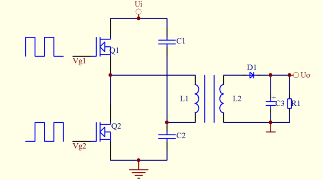 推挽式電路:每個開關管只作業(yè)半個周期,管子替換作業(yè),所以輸出功率較大,一起Q1和 Q2是共地的,驅動控制電路也很簡單,能夠選用經典的SG3525驅動。值得注意的是Q1和Q2一起導通時,也就意味著Ll和L3短路。實際中一般設置死區(qū)以避免兩個管子一起導通。