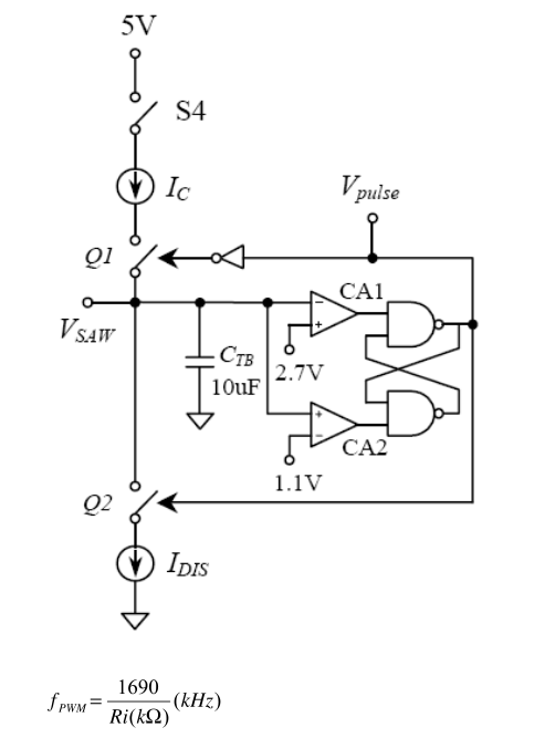 由IC內(nèi)部放置電容CTB的充放電産生振蕩波形,其上下限般定在2.7V輿1.1V,如圖三所示。常踞振蕩電原VSAW大於2.7V,比較器CA1的翰出凹凸羋位,Vpulse高高維位,Ql截止。比較器CA2的翰出高高譙位,Q2尊通,CTB放電。營VSAW小於1.1V,CA2的翰出凹凸隼位,CA1的翰出剎高隼位,Vpulse凹凸維位,Ql接通,Q2截止,CTB充電。藉由外加電阻RI輿參考電厘VR能夠産生一倜參電流IR,而踞茜波的充電電流是IC內(nèi)部很小的電流: