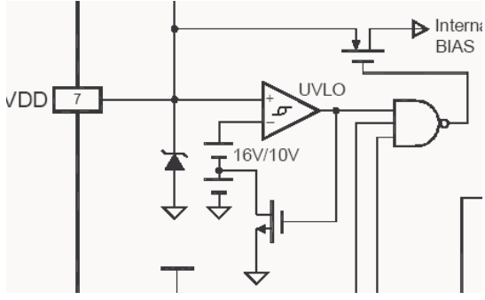 SG6841采用了欠壓鎖定比較器來確保輸出級被驅(qū)動之前,集成電路已完全可用。欠壓鎖定回路其實質(zhì)是一個滯回比較器,以防止在通過它們各自的門限時產(chǎn)生過錯的輸出動作。它的開啟電壓為16V,關(guān)閉電壓為10V。在啟動過程中,比較器反向輸入端為16V,當(dāng)VDD<16V時,比較器輸出為低電平,SG6841無法工作。當(dāng)VDD升到16V時,欠壓鎖定器輸出為高電平,SG6841正常工作,同時MOS管導(dǎo)通,使比較器反向輸入端為10V。當(dāng)VDD下降至10V時,欠壓鎖定器的輸出回到低電平,整個電路停止工作.SG6841的7腳端設(shè)置了一個32V的齊納二極管,確保內(nèi)部電路肯定工作在32V以下,以防電壓過高損壞芯片。
