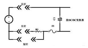 長短針法沖擊電流管束電路如上圖所示:在DC-DC電源板插入時(shí),長針接觸,輸入電容C1經(jīng)過電阻R1充電,當(dāng)電源板徹底插入時(shí),電阻R1被斷針短路。C1代表DC-DC電源的所有電容量。