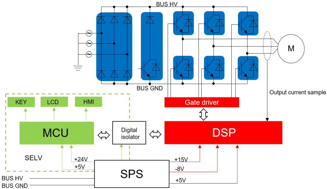 如圖4所示三相變頻器中,左下角綠色虛線圍起來的部分就是SELV電路,輔助開關(guān)電源SPS左側(cè)的供給MCU的+24V,+5V兩路開關(guān)電源與SPS的其余的電壓輸入輸出電氣連接點之間,都必須滿足加強絕緣要求。