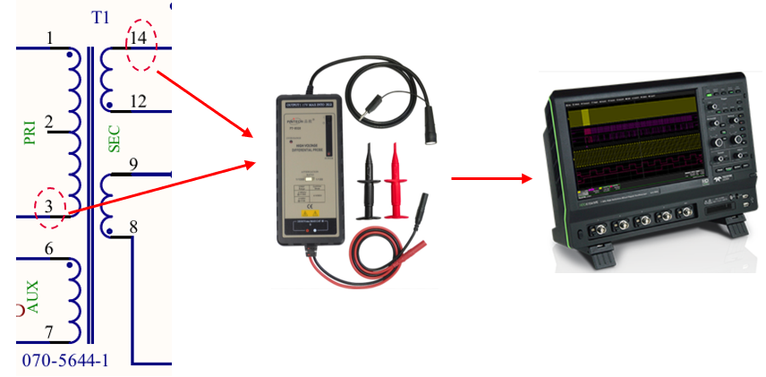 回到本文的重點,接下來測試一次側(cè)高壓端與SELV電路之間的重復(fù)峰值電壓是否超過750V閾值電壓。有經(jīng)驗的同學都知道,在開關(guān)電源中,重點是要找到變換器中的“動點”,也就是電壓的變化率dv/dt最大的節(jié)點,在圖5中,一次側(cè)高壓端的監(jiān)測點就可以選為Q1的Drain極,也就是變壓器T1的pin 3,安全二次側(cè)SELV的監(jiān)測點既可以選擇變壓器T1的pin 12,也可以選擇變壓器T1的pin 14,最后以正常帶載工況下一次側(cè)、二次側(cè)之間檢測到最大電壓為作為設(shè)定局部放電電壓UPD的基準。