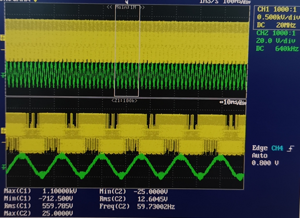 以三相480V變頻器為例,交流輸入線電壓為480Vrms,則其母線電壓平均值為480*1.35=648Vdc,也就是進入輔助開關(guān)電源SPS的工作電壓就是648V,這個電壓值已經(jīng)非常接近750V這個閾值,同時,需要注意的是,750V閾值電壓是在整機實際運行過程中,實際測試得到的一次側(cè)高壓端與SELV電路之間的重復(fù)峰值電壓,用高壓差分探頭分別勾取兩邊的監(jiān)測點,若此電壓超過750V,同時,在絕緣層厚度方向上的電壓應(yīng)力超過了1KV/mm,則局部放電測試認證必做。