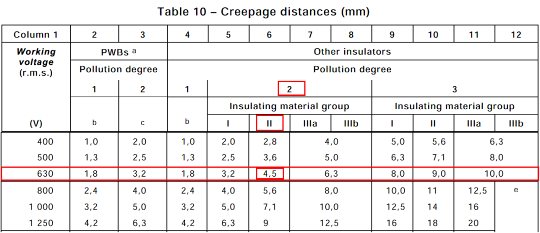 3、增加氣隙長度和爬電距離,以降低電場強度。以圖7中測得的UPD電壓有效值559Vrms去查詢對應(yīng)的加強絕緣爬電距離要求,如圖14所示,在污染等級為Ⅱ類,采用600>CTI≥400的絕緣材料的條件下,基本絕緣的爬電距離要求為4.5mm,則滿足加強絕緣要求的爬電距離至少為基本絕緣爬電距離要求的2倍,也就是要大于9mm。