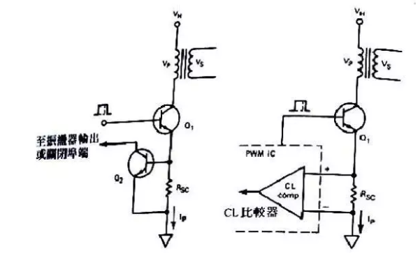 (a)圖:在輸出端有過載或短路情況發(fā)生時(shí),此時(shí)初級電流會很快的增加,Rsc上的就會產(chǎn)生電壓,此電壓超過B-E的導(dǎo)通電壓,那么Q2就會導(dǎo)通,就會把Q2集電極電位拉到地,如果接的是震蕩電路此時(shí)就會導(dǎo)至震蕩電路停止工作,從而達(dá)到保護(hù)的目的。