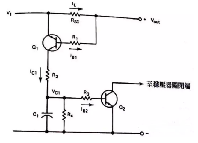 工作原理是:在正常的工作情況下,流入到Rsc上的Il不會產(chǎn)生很大的壓降,那么就不會使Q1導(dǎo)通,若負(fù)載電流足夠大就會在Rsc上產(chǎn)生電壓,使Q1導(dǎo)通。若Q1在OFF裝態(tài)時(shí),而且Ic1=0時(shí)C1會全部放電掉,因此Q2也會處于OFF狀態(tài),如果Il電流逐漸增加時(shí),則Il*Rsc=VbeQ1+Ib1R1,此時(shí)會集電極會有電流Ic1流過,并有下面的時(shí)間常數(shù)將C1充電T=R2*C1,那么C1上的電壓是:Vc1=Ib2R3+VbeQ2,為了使為了使電容器電壓的負(fù)載效應(yīng)減到最低值,我們可選用具有較高的HFE的達(dá)林凳管子來代替Q2,這樣可以把基極電流限制在微安培,我門在選擇電阻R4時(shí)要遠(yuǎn)遠(yuǎn)大于R3。這樣當(dāng)電流過載時(shí),C1電容會快速放電。