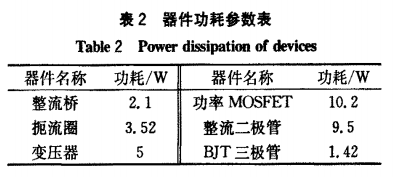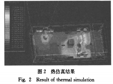 根據(jù)主要發(fā)熱元器件的損耗計算公式,得到各損耗值,將其導(dǎo)入仿真軟件;利用Ansoft仿真軟件的內(nèi)部求解器獲得實際電路的3D發(fā)熱模型,如圖2所示。從圖中可以清晰地看到電路內(nèi)部及各個元器件上的熱量分布情況。根據(jù)仿真結(jié)果(圖2)可知,功率MOSFET上的熱量和變壓器的熱量最高(紅色部分),這與從電路理論上分析求得的這兩種器件的功耗(見表2)相吻合。