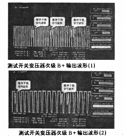 鑒于上述作業(yè)原理,對毛病現(xiàn)象及原因分析:我廠出產(chǎn)的AT2516UG機(jī)器,在電源作業(yè)時,開關(guān)變壓器有顯著的“哧、哧”聲,依據(jù)以往經(jīng)歷判斷此響聲為開關(guān)變壓器作業(yè)時發(fā)生的噪聲。由此,對開關(guān)變壓器次級(12)B+腳進(jìn)行波形測驗,詳細(xì)測驗如下: