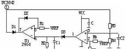 當(dāng)輸出電路短路,輸出電壓消失,光耦OT1不導(dǎo)通,UC3842①腳電壓上升至5V左右,R1與R2的分壓超越TL431基準(zhǔn),使之導(dǎo)通,UC3842⑦腳VCC電位被拉低,IC停止作業(yè)。UC3842停止作業(yè)后①腳電位消失,TL431不導(dǎo)通UC3842⑦腳電位上升,UC3842重新啟動,循環(huán)往復(fù)。當(dāng)短路現(xiàn)象消失后,電路能夠主動康復(fù)成正常作業(yè)狀況。