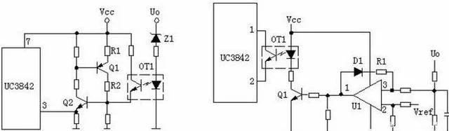 輸出限壓維護(hù)電路:輸出限壓維護(hù)電路如下圖,當(dāng)輸出電壓升高,穩(wěn)壓管導(dǎo)通光耦導(dǎo)通,Q1基極有驅(qū)動電壓而道通,UC3842③電壓升高,輸出下降,穩(wěn)壓管不導(dǎo)通,UC3842③電壓下降,輸出電壓升高。循環(huán)往復(fù),輸出電壓將安穩(wěn)在一范圍內(nèi)(取決于穩(wěn)壓管的穩(wěn)壓值)。