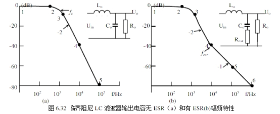 濾波電容有ESR的LC濾波器幅頻特性如圖6.35b的曲線123456。大多數(shù)濾波電容具有ESR。在f0以上的低頻段,容抗遠遠大于ESR,從Uo看到阻抗僅是容抗起首要作用,斜率仍為-40dB/dec;在更高頻時,esrRC<<ω1,從輸出端看的阻抗僅僅ESR,在此頻率規(guī)模,電路變?yōu)?/span>LR濾波,而不是LC濾波。即