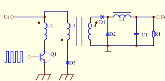 這種開關(guān)電源電路,輸出功率較大(不管Q1導(dǎo)通與截止,都有能量傳遞到負(fù)載上)―可是存在問題是:變壓器結(jié)構(gòu)凌亂,體積較大,所以其實(shí)踐運(yùn)用很少。
