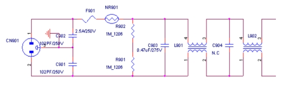 c901、C902為共模電容,首要克制差模攪擾,即前方和零線別離與地之間的攪擾。電容值愈大對低頻攪擾克制效果愈好,在這里選用102PF/250V。
