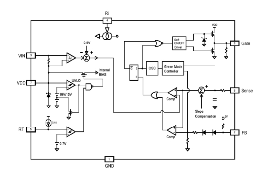 5.內(nèi)建電壓補償電路可在一個較大的AC輸入范圍內(nèi)完結(jié)功率約束控制,并供應(yīng)過載、短路保護(hù)功用。此外,還設(shè)有低電壓確定(UVLO)功用,使作業(yè)更安穩(wěn)、牢靠。