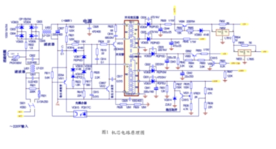 機(jī)芯的開(kāi)關(guān)電源具有結(jié)構(gòu)簡(jiǎn)略,經(jīng)濟(jì)實(shí)用等特點(diǎn),是彩色電視機(jī)用得最多的一種開(kāi)關(guān)電源,廣泛用于新式數(shù)碼彩電中。目前康佳、長(zhǎng)虹、海信、廈華等品牌彩電,均有許多機(jī)型使用了這一電源。本文以A25機(jī)芯為例,來(lái)分析這種開(kāi)關(guān)電源的作業(yè)進(jìn)程及檢修方法,具體電路見(jiàn)圖1。