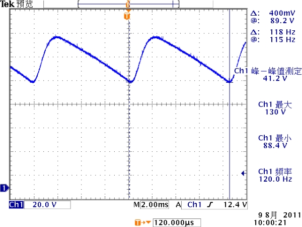 低頻紋波是與輸出電路的濾波電容容量相關(guān)。因?yàn)殚_關(guān)電源體積的約束,電解電容的容量不可能無約束地添加,導(dǎo)致輸出低頻紋波的殘留,該輸出紋波頻率隨整流電路方式的不同而不同。