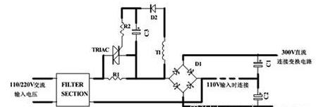 關(guān)于大功率AC-DC電源,沖擊電流管制器材在正常作業(yè)時(shí)應(yīng)該短路,這樣可以減小沖擊電流管制器材的功耗。如下圖所示:挑選R1作為發(fā)起電阻,在發(fā)起后用可控硅將R1旁路,因在這種沖擊電流避免電路中的電阻R1可以選得很大,通常不需要改動(dòng)110V輸入倍壓和220V輸入時(shí)的電阻值。圖中所畫為雙向可控硅,也可以用晶閘管或繼電器將其替代。