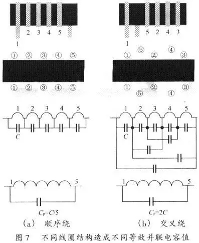 在開關電源中電感的Cp應該控制得越小越好。一起有必要留心到,同一電感量的電感會由于線圈結(jié)構(gòu)不同而產(chǎn)生不同的Cp值。圖7就閃現(xiàn)了同一電感量的電感在二種不同的線圈結(jié)構(gòu)下不同的Cp值。圖7(a)電感的5匝繞組是按次第繞制。這種線圈結(jié)構(gòu)的Cp值是l匝線圈等效并聯(lián)電容值(C)的1/5。圖7(b)電感的5匝繞組是按穿插次第繞制。其間繞組4和5放置在繞組1、2、3之間,而繞組l和5非常靠近。這種線圈結(jié)構(gòu)所產(chǎn)牛的Cp是1匝線圈C值的兩倍。