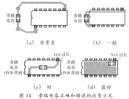 旁路電容(Decouple)的放置也要考慮到它的串聯(lián)電感值。旁路電容有必要是低阻抗和低ESL乩的瓷片電容。但假設一個高品質(zhì)瓷片電容在PCB上放置的辦法不對,它的高頻濾波功用也就消失了。圖14閃現(xiàn)了旁路電容正確和差錯的放置辦法。