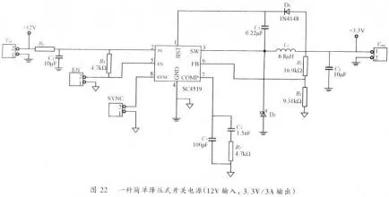 4、開關電源PCB排版例2圖22是另一種降壓式開關電源,該電源能使12V輸入電壓轉(zhuǎn)換成3.3V輸出電壓,輸出電流可達3A。此電源上運用了一個集成電源控制器(Semtech類型SC4519)。這種控制器將一個功率管集成在電源控制器芯片中。這樣的電源非常簡略,特別適宜應用在便攜式DVD機,ADSL,機頂盒等消費類電子產(chǎn)品。