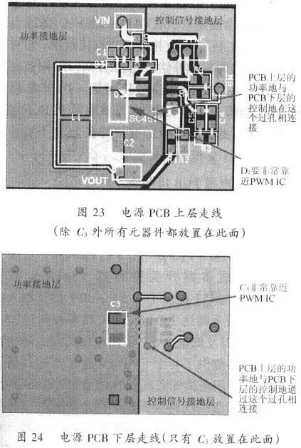 圖23是該電源PCB上層排地圖。為了力便讀者了解,功率接地層和控制信號接地層分別用不同顏色來表明。在這里輸入插座被放置在PCB的上方,而輸出插座被放置在PCB的下方.濾波電感(L1)被放在PCB左邊并靠近功率接地層,而關于噪音較敏感的反響補償電路(R3,C4,C5)則被放存PCB右邊并靠近控制信號接地層。D2非常靠近SC4519的腳3及腳4。圖24是該電源PCB基層排地圖。輸入濾波電容(C3)被放置在PCB基層并非常靠近SC4519和功率接地層。