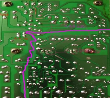 220V交流輸入,通過穩(wěn)妥,負(fù)溫度熱敏電阻,安規(guī)電容,共模電感組成的抗電磁干擾電路及過流保護(hù)電路,通過整流二極管整流濾波后輸出300V左右的直流電壓。這是電源板正面圖,用紅線畫出的部分為熱地與冷地部分(開關(guān)電源接地方式有熱地和冷地之分,與220V電源直接相連的地稱為熱地,人體直接觸摸會(huì)觸電;經(jīng)開關(guān)變壓器阻隔后,再整流濾波后的地稱為冷地,人體直接觸摸不會(huì)觸電)。這是電路板反面圖,在圖中標(biāo)出開關(guān)電源的輸入部分、300V濾波大電容、開關(guān)管、開關(guān)變壓器、肖特基二極管等首要元器材。