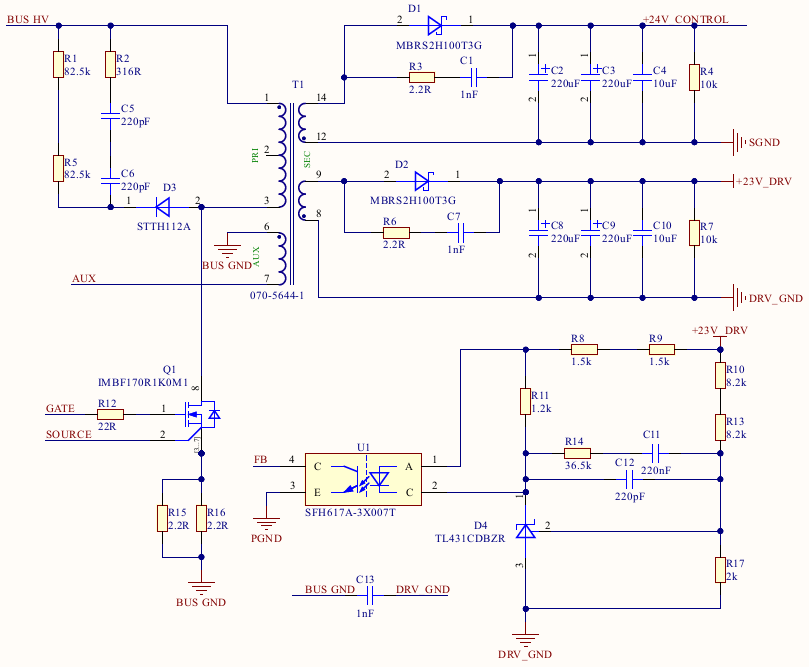 假設輔助開關電源SPS采用了經(jīng)典的單管反激變換器,如圖5所示,SPS從變頻器的BUS電容上取電,這里為了簡化電路,變壓器T1的輸出只設計了兩路輸出電壓,分別給IGBT的驅動器和MCU側供電,從前面的定義可以看出,給MCU供電的+24V_CONTROL就是SELV電路,需要與其他電路之間做加強絕緣處理,也就是變壓器T1的pin12-pin14所在的繞組與其余繞組之間必須滿足加強絕緣要求,同時,在PCB板上,+24V_CONTROL所在電路與其他電路之間的爬電距離也必須滿足加強絕緣要求。