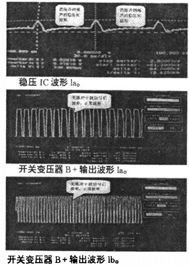 經(jīng)過在TL431并聯(lián)0.47/63V電容后,再次檢驗TL431穩(wěn)壓TC負極波形,不規(guī)則噪聲頻率消逝(如圖穩(wěn)壓ICla);檢驗開關(guān)變壓器次級B+波形(如圖開關(guān)變壓器次級B+波形1a、1b),波形中130uS-70uS周期脈沖煩擾信號消逝;此時再也聽不到變壓器“哧哧”響聲。細致檢驗經(jīng)上述更改后整機哧、哧聲消逝,并且對正常作業(yè)無任何影響。使電源作業(yè)更安穩(wěn)。