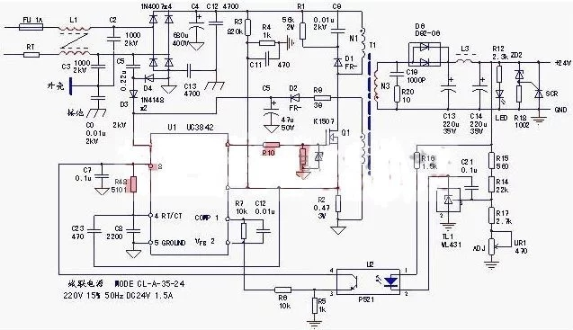 U1芯片和1、2腳外圍元件R7、C12,也是穩(wěn)壓回路的一部分。實際上,TL1、U1組成了(相對于U1內(nèi)部電壓差錯放大器)外部差錯放大器,將輸出24V的電壓改動反應(yīng)回U1的反應(yīng)電壓信號輸入端。