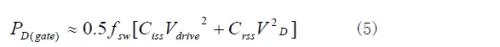 功率MOSFET驅(qū)動(dòng)功率比雙極型功率晶體管高。MOSFET柵極有兩個(gè)與漏源極相連的等效電容,即柵源電容Ciss和漏源電容Crss。MOSFET柵極驅(qū)動(dòng)的損耗來(lái)自于注冊(cè)MOSFET時(shí)輔佐電壓對(duì)柵極電容的充電,關(guān)斷MOSFET時(shí)又對(duì)地放電。柵極驅(qū)動(dòng)損耗核算由式(5)給出。