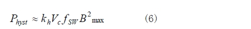 磁滯損耗與繞組的匝數(shù)和驅(qū)動(dòng)方式有關(guān)。它決議了每個(gè)作業(yè)周期在B-H曲線內(nèi)掃過(guò)的面積。掃過(guò)的面積便是磁場(chǎng)力所作的功,磁場(chǎng)力使磁心內(nèi)的磁疇重新排列,掃過(guò)的面積越大,磁滯損耗就越大。該損耗由式(6)給出。