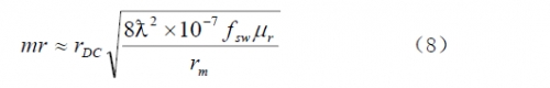 電阻損耗是變壓器或電感內(nèi)部繞組的電阻產(chǎn)生的損耗。有兩種方式的電阻損耗:直流電阻損耗和集膚效應(yīng)電阻損耗。直流電阻損耗由繞組導(dǎo)線的電阻與流過(guò)的電流有效值二次方的乘積所決議。集膚效應(yīng)是因?yàn)樵趯?dǎo)線內(nèi)強(qiáng)溝通電磁場(chǎng)效果下,導(dǎo)線中心的電流被“推向”導(dǎo)線表面而使導(dǎo)線的電阻實(shí)踐添加所造成的,電流在更小的截面中活動(dòng)使導(dǎo)線的有效直徑顯得小了。式(8)給出了這兩個(gè)損耗在一個(gè)表達(dá)式中的計(jì)算式。