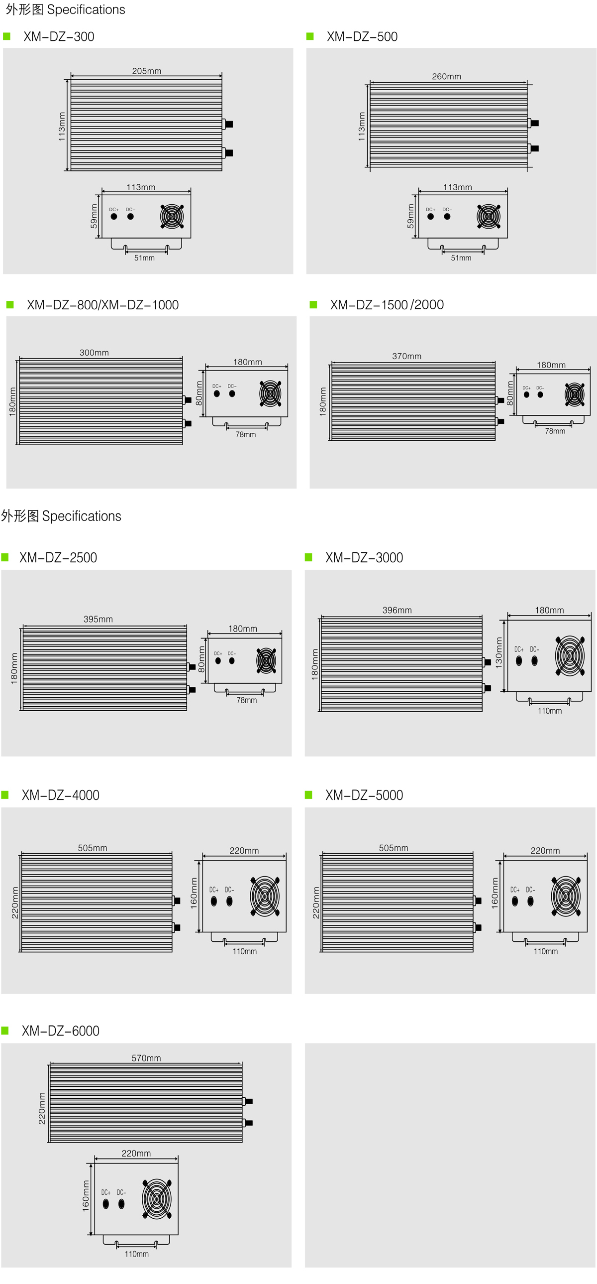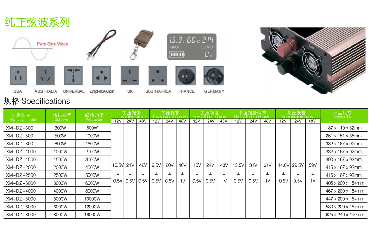 有短路、過載、欠壓、過壓、過溫、防反接保護 散熱風機智能控制 工作噪音小、效率高 鋁裝外殼,表面噴砂陽極氧化處理、硬度高、外形美觀